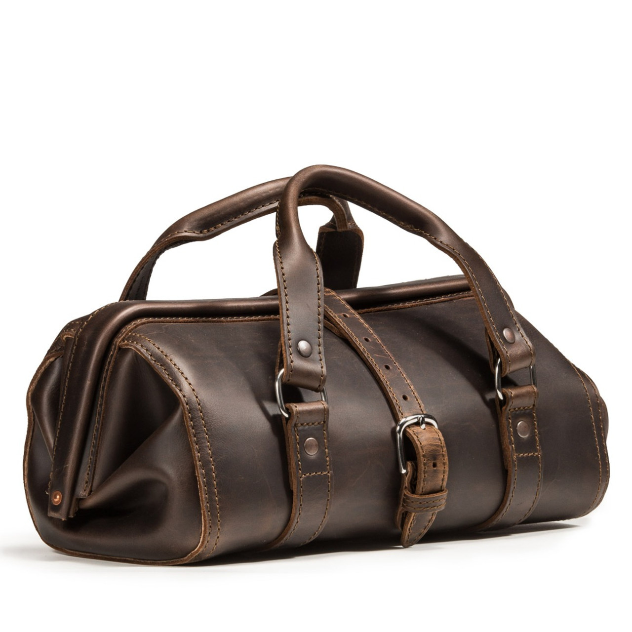 This leather tool bag is designed with only one large piece of leather for the body and one piece on each end. Seams are where tool bags start falling apart, so we designed this doctor's bag with as few as possible.